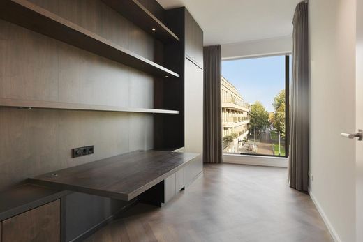 On the avenue side: working room with fixed furniture with a folding guest bed. There is also a door to the balcony. Second bedroom v.v. fixed bedroom furniture and again a door to the balcony. The third bedroom is the 'master' with a fixed bed-furniture. The passage to the large bathroom is used as a walk-through closet. Fully custom-made, with lighting and movable clothes racks for optimal space utilisation of the high cabinets.